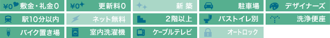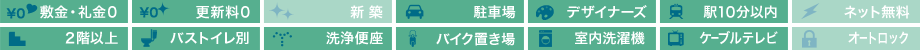 | 設備・特徴 | 2口コンロ ウォシュレット 敷金礼金なし 更新料無料 バストイレ別 フローリング クローゼット 南向き 2階以上 最上階 室内洗濯機置場 照明付き ケーブルTV バイク置場 | ||