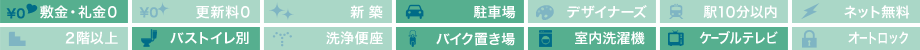 | 設備・特徴 | 2口コンロ ウォシュレット TVドアホン バストイレ別 フローリング クローゼット 南向き 角部屋 独立洗面台 室内洗濯機置場 照明付き エアコン ケーブルTV バイク置場 | ||