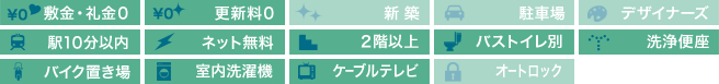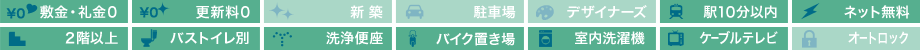 | 設備・特徴 | 2口コンロ ウォシュレット 敷金礼金なし 更新料無料 駐車場2台あり インターネット無料 バストイレ別 フローリング クローゼット 南向き 2階以上 独立洗面台 室内洗濯機置場 ケーブルTV バイク置場 | ||