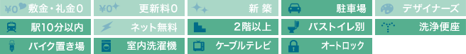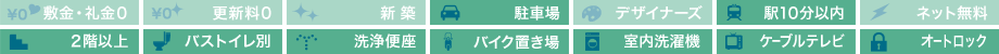 | 設備・特徴 | 2口コンロ システムキッチン ウォシュレット 浴室乾燥機 オートロック バストイレ別 フローリング クローゼット 南向き 2階以上 独立洗面台 室内洗濯機置場 照明付き エアコン ケーブルTV エレベーター バイク置場 | ||