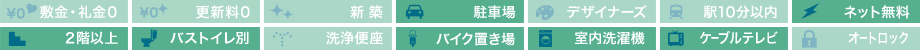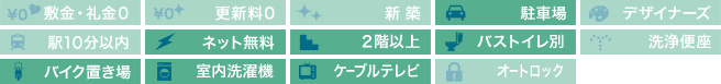 | 設備・特徴 | カウンターキッチン 3口コンロ システムキッチン バストイレ別 フローリング クローゼット 2階以上 独立洗面台 室内洗濯機置場 ケーブルTV エレベーター バイク置場 | ||