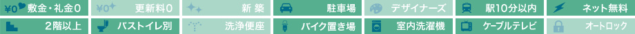 | 設備・特徴 | システムキッチン バストイレ別 フローリング クローゼット 南向き 2階以上 室内洗濯機置場 照明付き エアコン ケーブルTV バイク置場 | ||